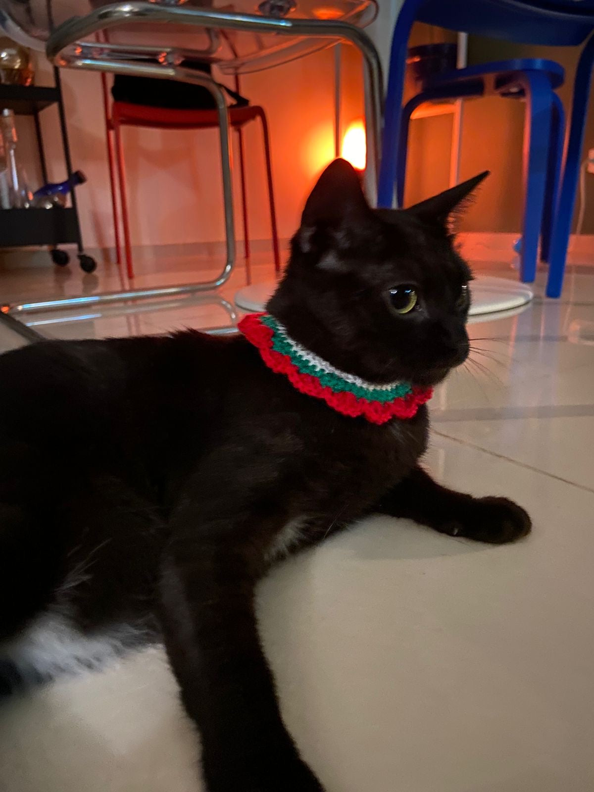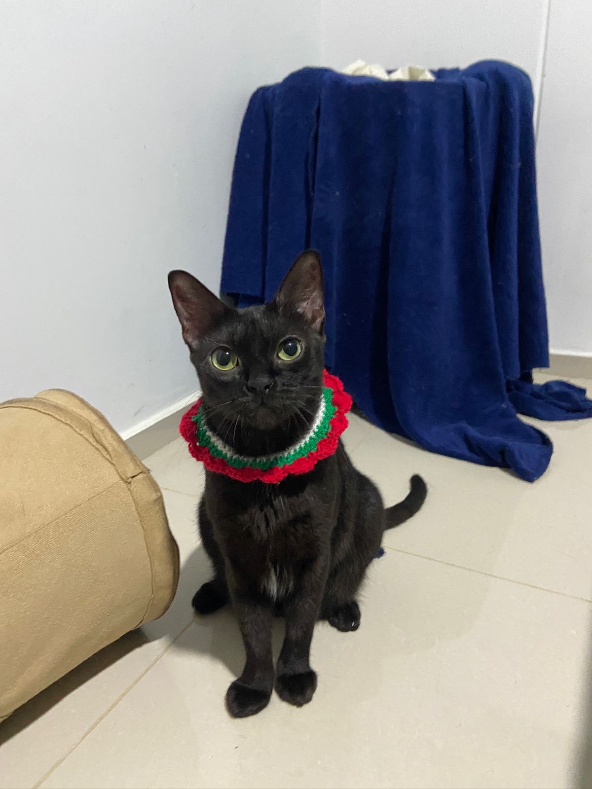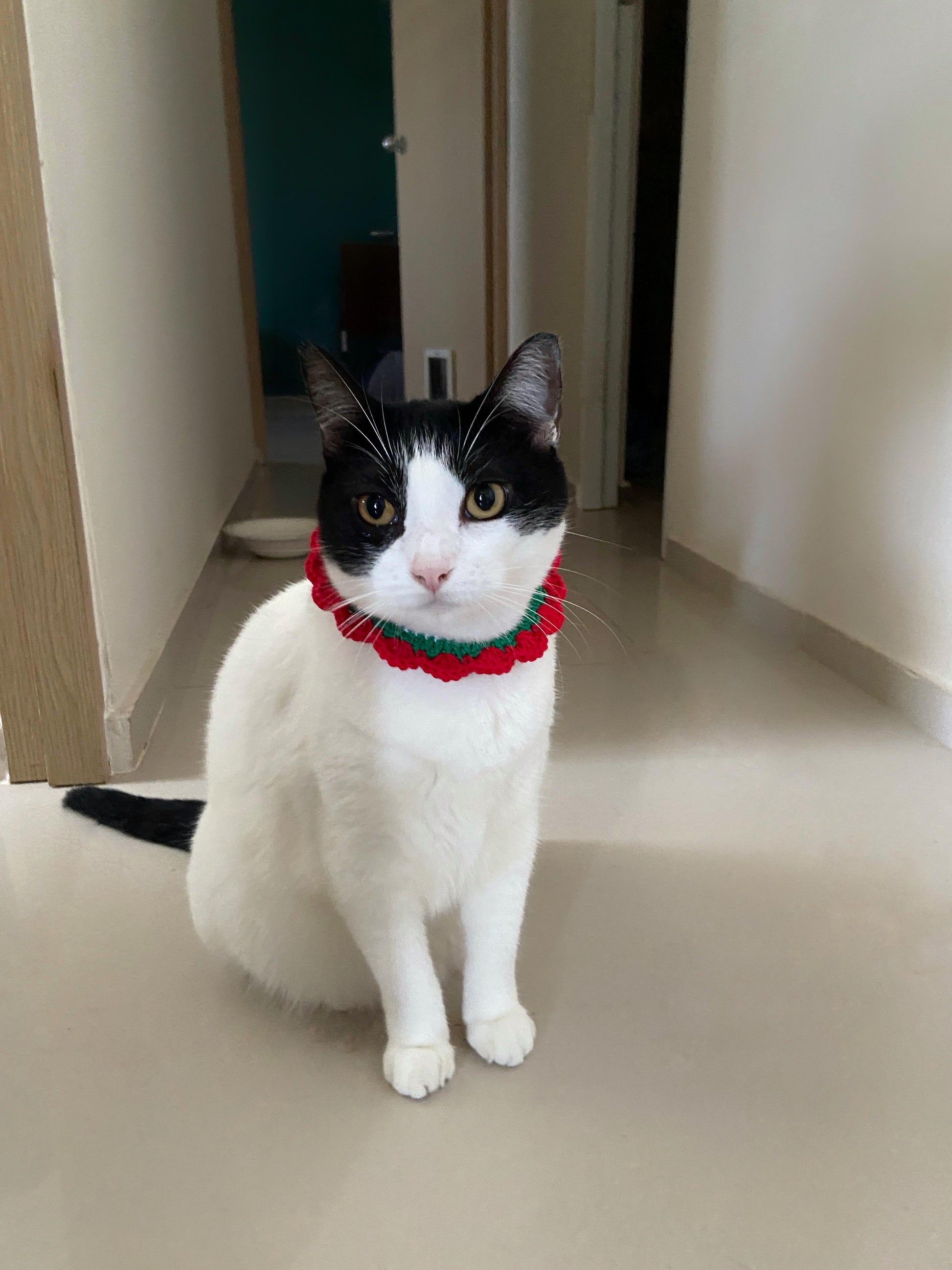 Collar tejido a mano, se ajusta al tamaño del cuello de tu michi. Se ve hermoso para Navidad!!